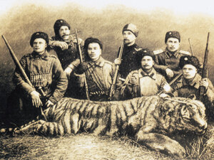 Cossacks pose with a tiger they hunted in Russia's Far East, circa 1885.Courtesy of Vladimir Trofimov